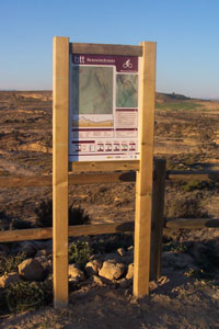 Trabajos de adecuación del sendero e instalación de señalización para poner en valor el castillo de Daroca y la ruta que permite visitar el conjunto amurallado. Para la señalización se optó por instalar flechas de metal sobre postes de madera tratada. De este modo se integraba el diseño de la señalética en el entorno urbano. El uso de balizas rotuladas sirvió de complemento a la señalización direccional, no siendo necesario el uso de marcas de pintura ni otros soportes.